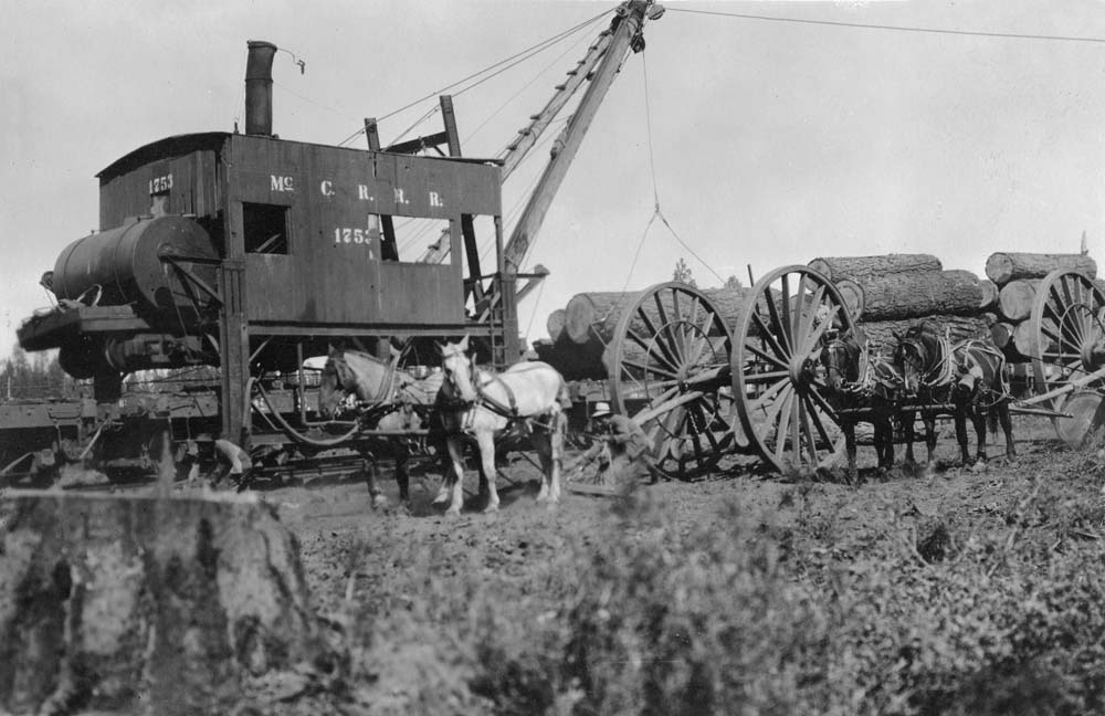 Added March 2026. An early shot of McCloud River McGiffert loader #1753 at work in a horse and high wheel logging side. Jeff Moore collection. |