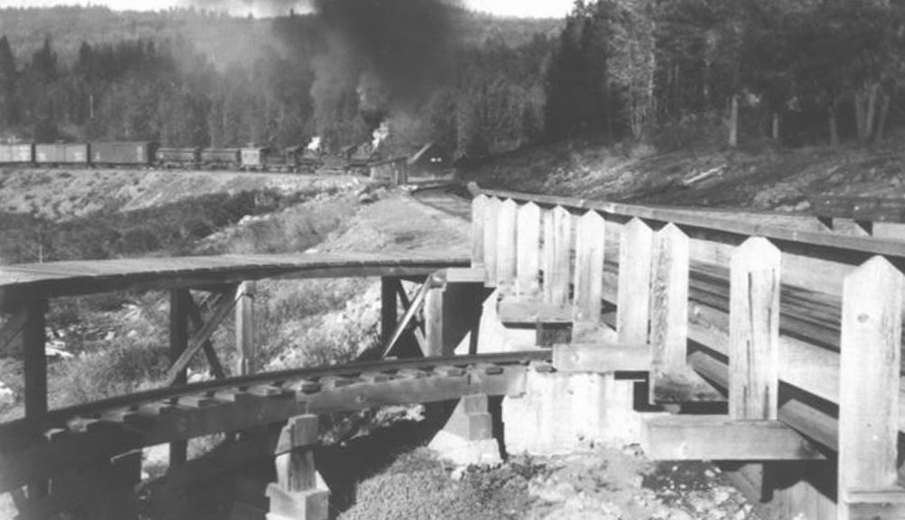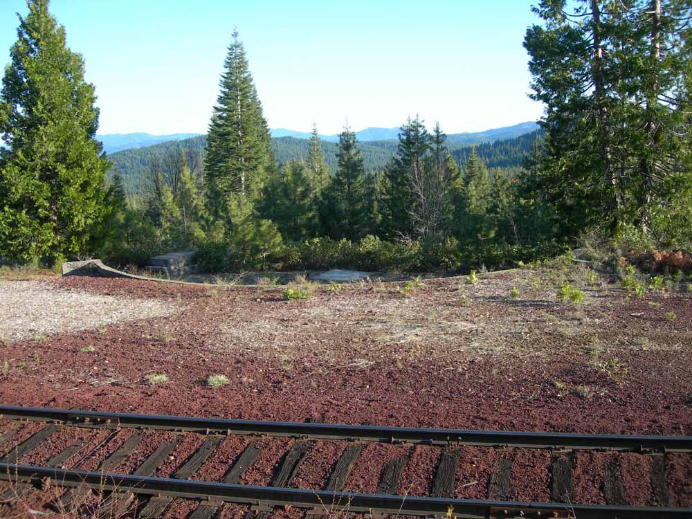 Two of the small early prairie-type locomotives lead a train into the Signal Butte switchback. The turntable used to turn snowplows during the winter months is in the foreground. This turntable remained in use to turn hy-rail vehicles into the early 1970s before it was removed. Photograph courtesy of Heritage Junction Museum of McCloud, Inc. |