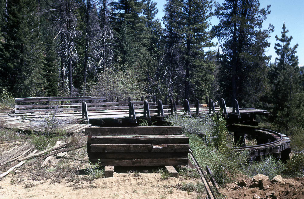 Crane #72 and a flatcar on the turntable lead as seen from an excursion in the middle 1960s. Jeff Moore collection. |