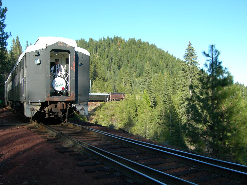 Conductor Roger Titus is guarding the reverse move as the #38 starts shoving the Shasta Sunset Dinner Train out of the switchback and towards the summit in May 2007. Jeff Moore. |
