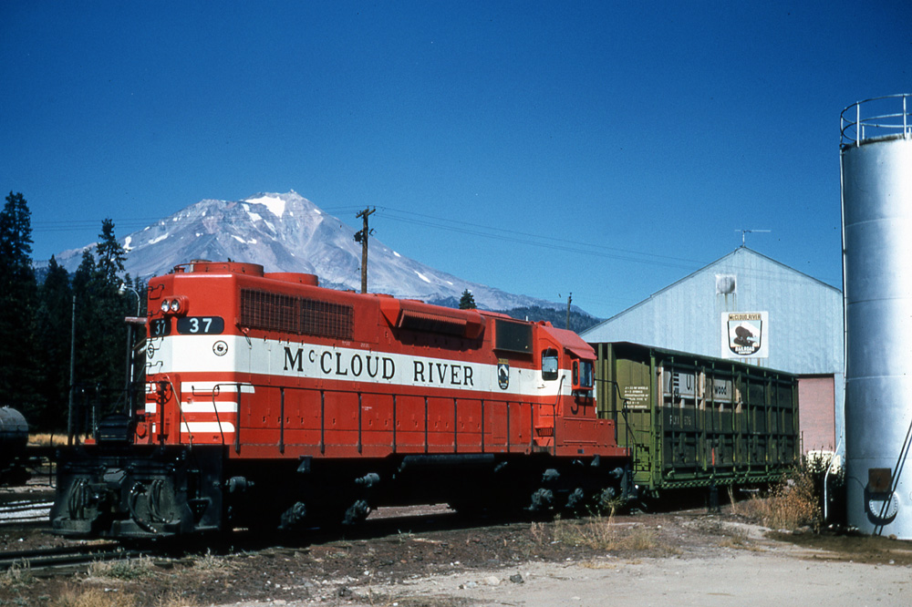 The #37 switching a Thrall built car in McCloud. Some of the differences between the car shapes and ends can be seen by comparing this photo with the #1254 above. Jeff Moore collection. ![]()