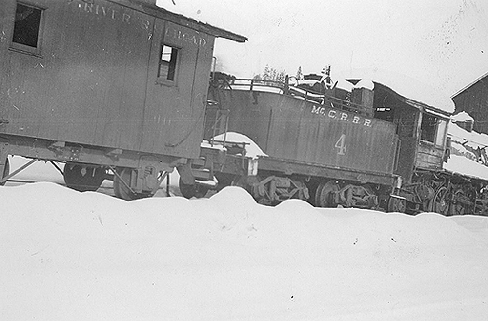 Partial view of the derelict caboose #011 sharing the dead line with locomotive #4 in McCloud. Travis Berryman collection.