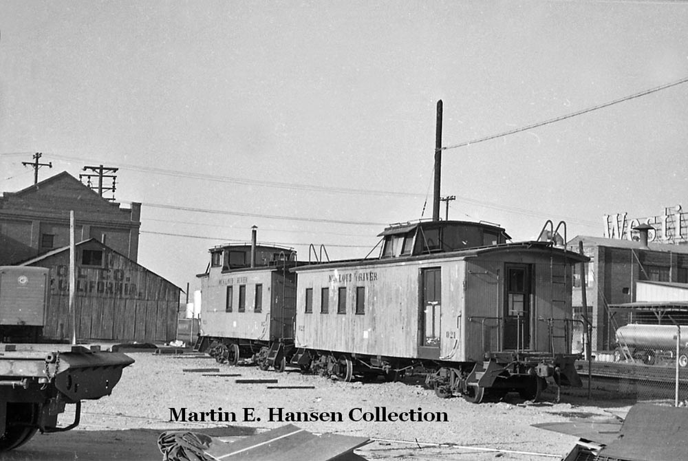 Another shot of the two cabooses in the A&K yard in Emeryville. Martin E. Hansen collection. |