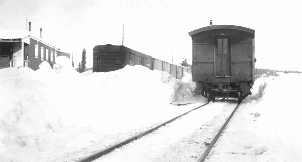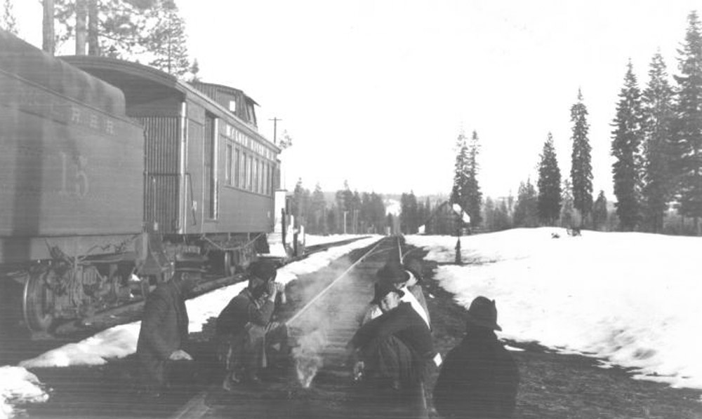 | The #03 at Bartle with a crew that has built a small warming fire on the main line. Photograph courtesy of Heritage Junction Museum of McCloud, Inc. |