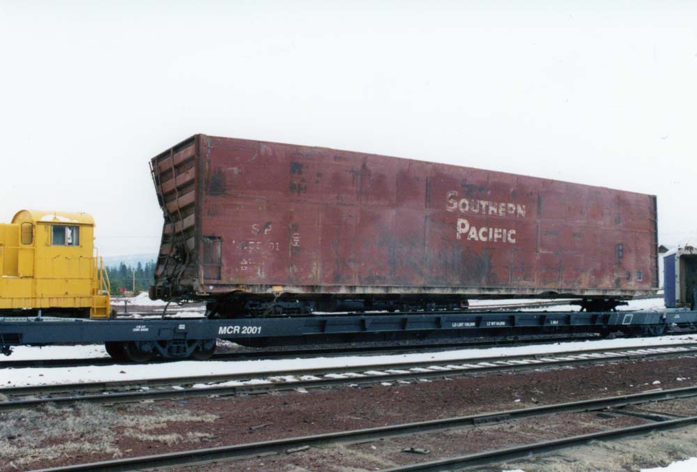 In 1998/1999, the McCloud shop rebuilt seven ex-Canadian National automobile cars into hospital cars, which are usually used to transport wreck damaged railcars that cannot otherwise be moved on their own wheels. The shops removed the carbodies from the frames and then installed bolsters that could be adjusted to handle varying car lengths. The McCloud Railway used some of the cars on their own wrecks and leased others out to Union Pacific to help clean up a derailment near Cantara Loop. The railroad sold all of the cars except for #2001 and #2003 to Jim Dobbas Incorporated in early 2004, with the remaining two sold to Quality Rail Services by 2006. |