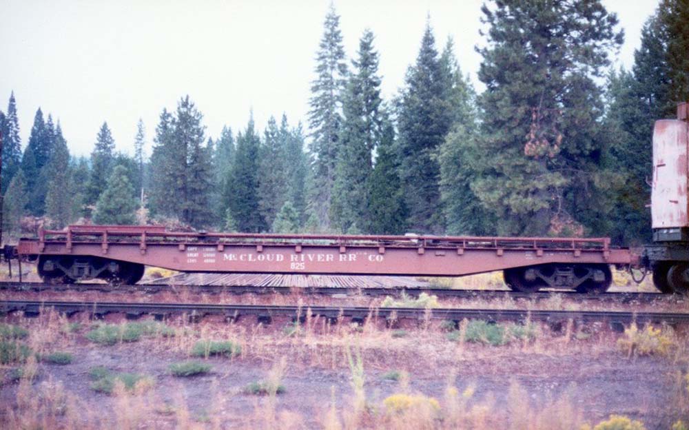The #825 seen here in the McCloud yards with a load of trucks, possibly from a derailment