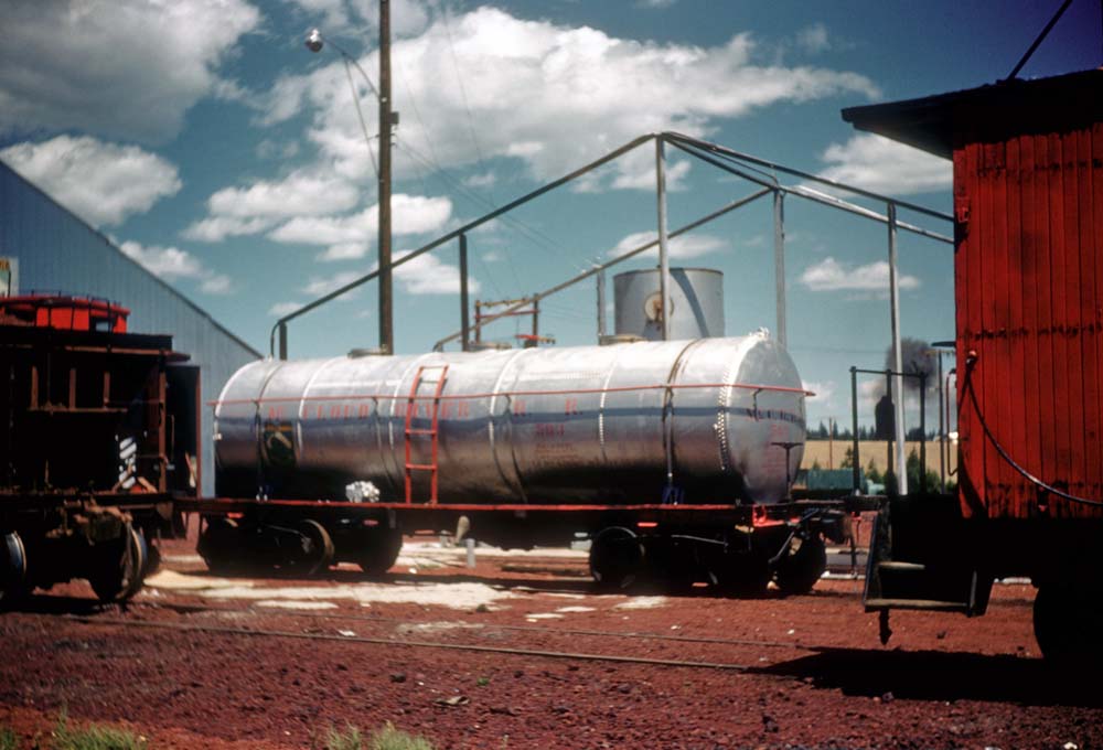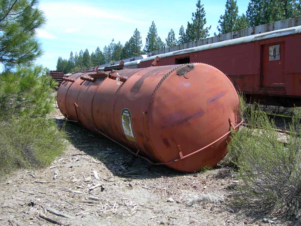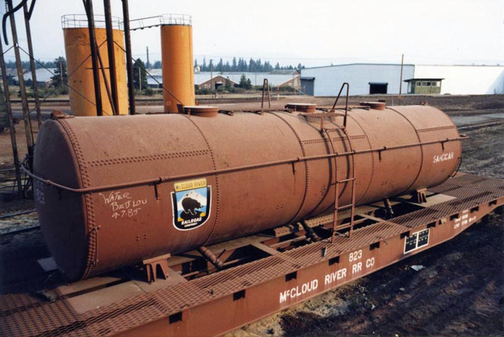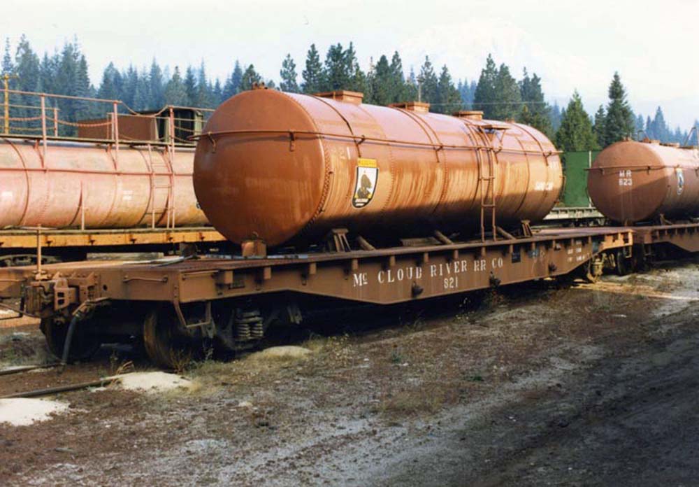 #821 (#504:2) Converted 7/1972 from maintenance flat #821. Consisted of an 8,000-gallon tank car body, probably salvaged from #2005, #2008. #2010, or #2011, mounted on the flat. Referred to as #504 after 1977 in The Official Railway Equipment Register, though photographs show the car only stenciled as #821. Sold to McCloud Railway in 1992. Retired 1993, with the #821 converted to equipment transport flat #821. |