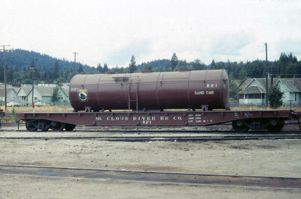 The McCloud River Railroad maintained a classic locomotive sanding facility adjacent to the McCloud turntable through the steam era. In 1957, the railroad started building a new sanding tower to supply the diesel locomotives then coming into service. A hopper constructed next to the tower stored sand, and the McCloud shop built a sand car to transport sand to McCloud. When empty, the railroad would haul the car to one of the connecting carriers, who would fill the car and return it loaded to McCloud. A second sand car replaced the hopper by the late 1970s, and then a new hopper constructed by the McCloud Railway replaced the sand cars altogether. |