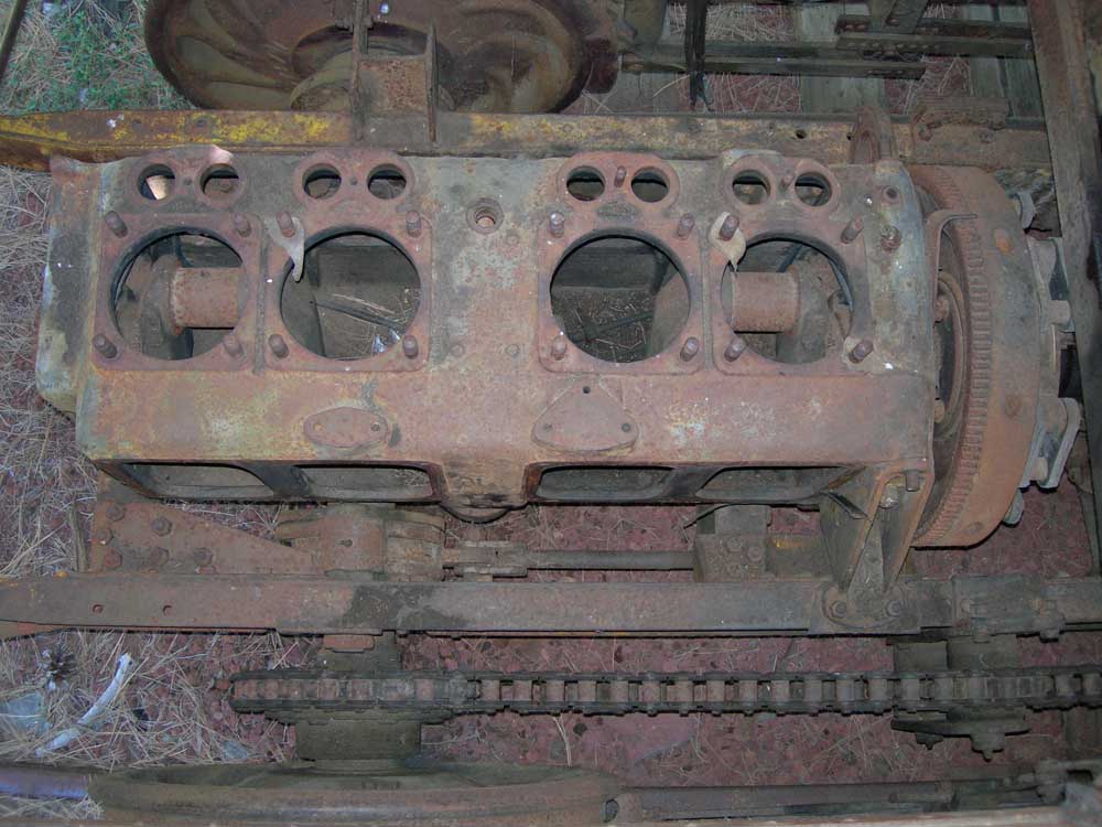 The remnants of the engine block. The engine drove the back axle directly and the front axle through the chain.