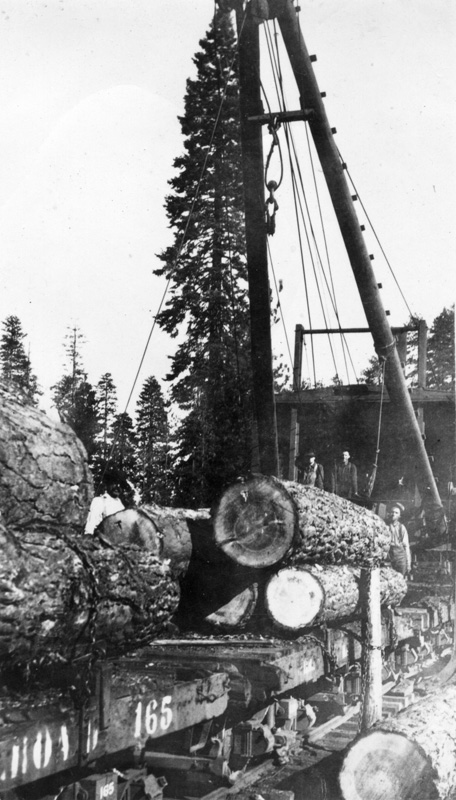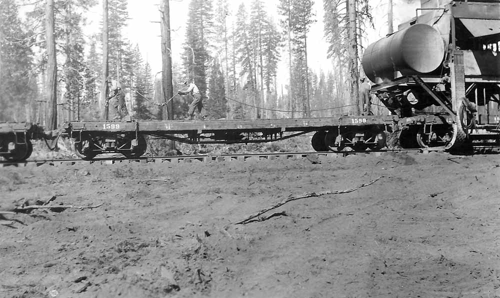 Moving the string of log flats under the loader required either a switch engine, judicious use of gravity, or a car line as seen here. The line would be secured to the back of the car, and then when pulled back in would move the string of cars so that the next empty could be loaded. Roland Edwards photo, courtesy Marilyn Rountree. |