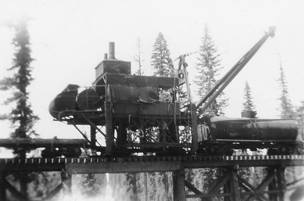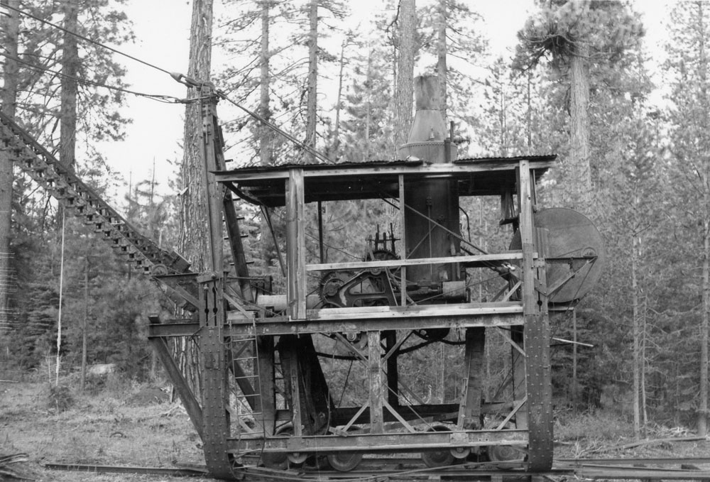 One of the later McGifferts crossing the trestle over Highway 89 near Pondosa in transit to a new landing site. Note that the running gear is down, allowing the loader to propel itself along the rails. Photo from the Jeff Moore collection. |