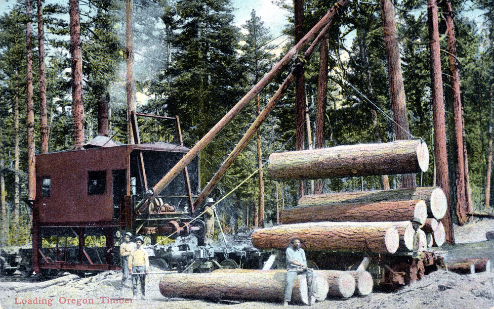 A colorized post card marked as "Loading Oregon Timber" actually depicts one of McCloud's first McGiffert loaders. Jeff Moore collection. |