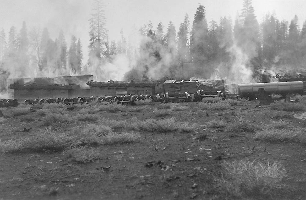 Retired water cars and other equipment being burned at the upper end of the McCloud