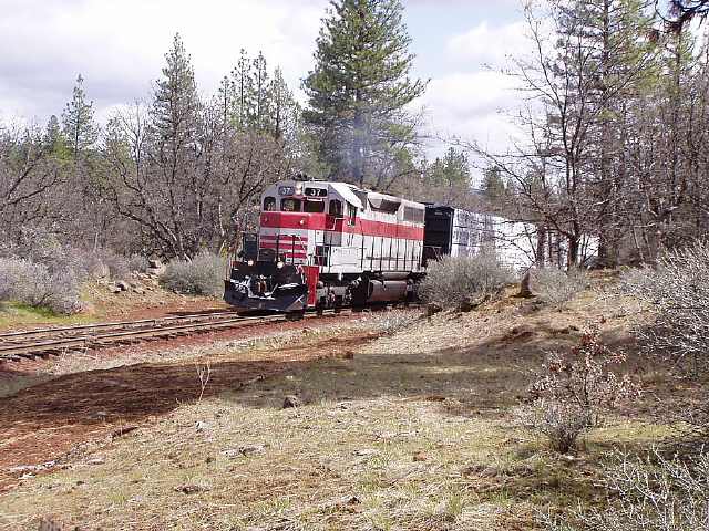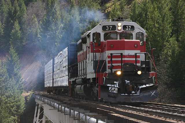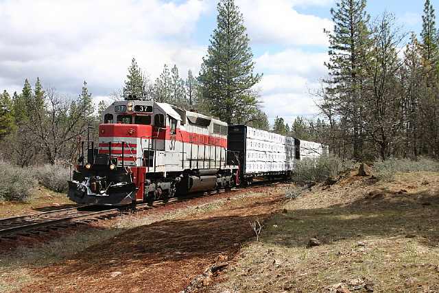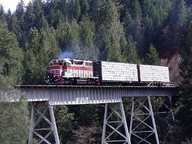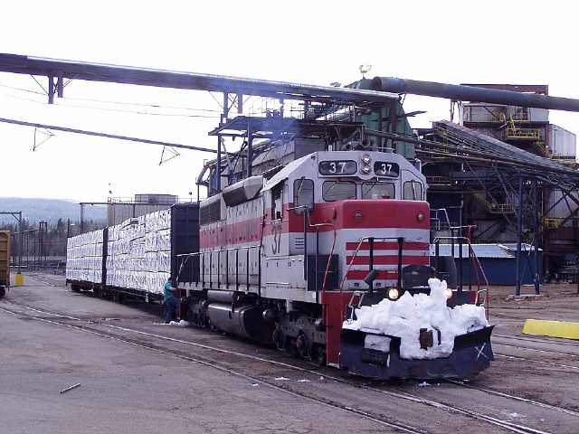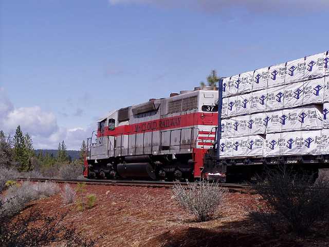 The #37 has finished switching the two loads out of the loading dock at the Sierra Pacific mill and is ready to depart for the return trip back to McCloud. George Landrock photo.
