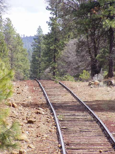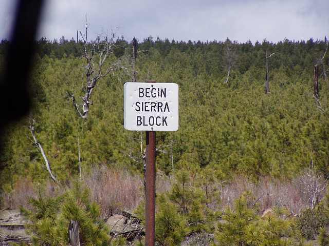 Shortly after leaving the mill the train passes the sign marking the end of mill trackage and the start of the Sierra block. This part of the railroad was burned over in the 1992 Fountain Fire, and a new forest is growing up through the one burned by the fire. George Landrock photo.