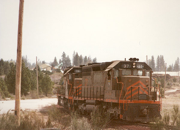 August 1986 finds the #37 at the uphill end of a healthy cut of loaded bulkhead flats in the McCloud yard.