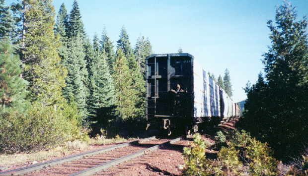 Pierce, CA, 11/2002. With the #38 in the shops and the #37 going to Lookout, the #36 is left to handle the Yard & Hill Job by itself this day, requiring that the railroad today take the Union Pacific bound traffic over the hill today in two cuts. Here conductor Keith Jones rides the first cut as it arrives at Pierce, the summit of the hill between McCloud and Mt. Shasta. The train has already gone through the switchback and is now backing the rest of the way to Mt. Shasta City. |