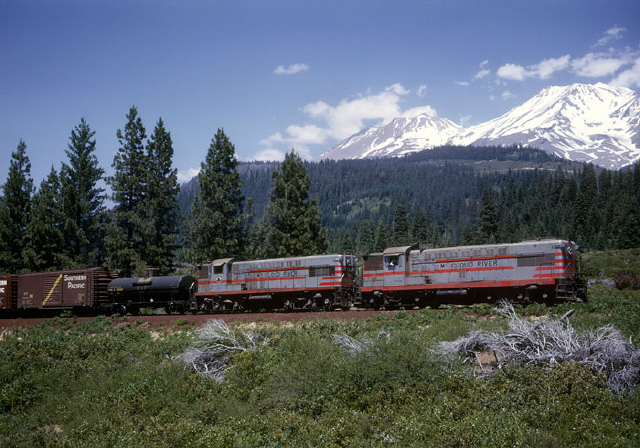 A Yard & Hill Job from an earlier era: Baldwin diesels #29 and #34 moving a Mt. Shasta bound train up the hill in the late 1960s. Photo by and courtesy of John West. |