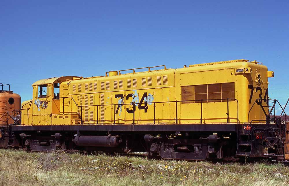Baldwin painted the #1501 in a dark green and gold paint scheme for its tour, which Kennecott adopted for all of its equipment after purchasing the unit. The former demonstrator, by now numbered 734, is seen