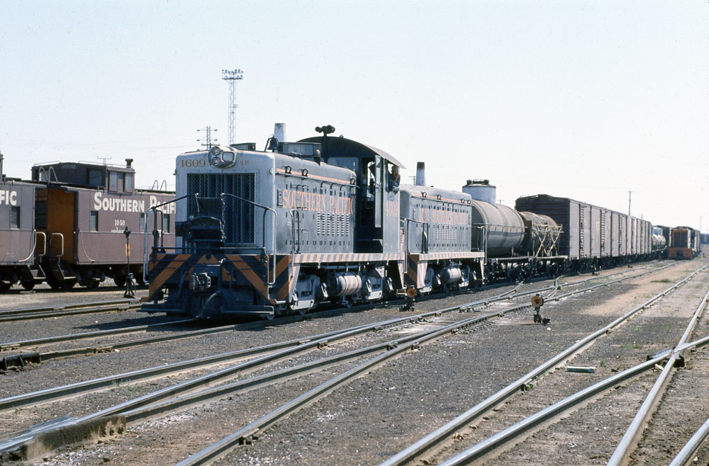 EMD TR-6 Cow/Calf pair #1600 and #1600B EMD's TR-6 demonstrator promoted their version of the multiple switchers working together, but in their case they permanently coupled together two 800-horsepower switchers, one with a cab (the "cow") and one without (the "calf") that would be controlled from the "cow" unit. The pair demonstrated on the Southern Pacific and many connecting shortlines, including at least a day or two on the McCloud River, from November 1950 through April 1951. EMD produced a report to McCloud trying to get them to purchase similar locomotives without success. SP purchased the demonstrator set and ordered several similar cow/calf pairs, mostly for hump yard switching and branchline chores. The cow, EMD's c/n 13549, served SP well as their #4600 and then #1100 until larger power and increasing age prompted its retirement. SP optioned the #1100 in 1985 to John Bradley of Laytonville, CA, who stored it on and occassionally leased it to the Eureka Southern railroad. Bradley returned the unit to the SP when his option expired in 1986, and SP promptly sold the unit to Sierra Pacific Industries for use on the Susanville Division of its Quincy Railroad. The #1100 now resides in the collection of the Western Pacific Railroad Museum in Portola, California. ![]()