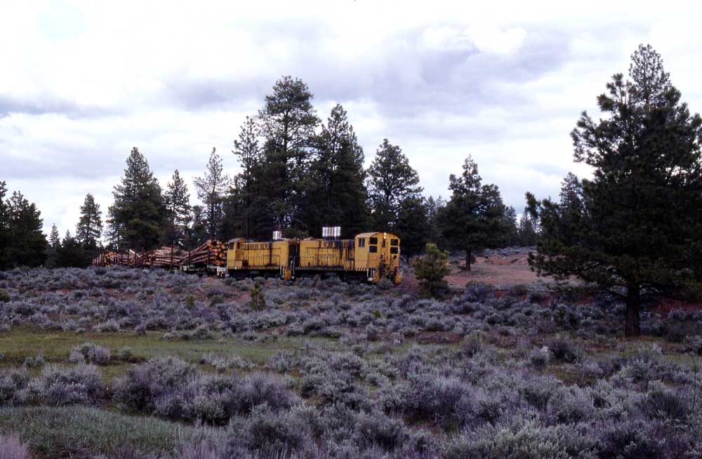 Weyerhaeuser Timber #101 and #102, the former demonstrators, are seen here leading a log train out of the woods east of Klamath Falls. John Henderson photo, Jeff Moore collection. ![]()