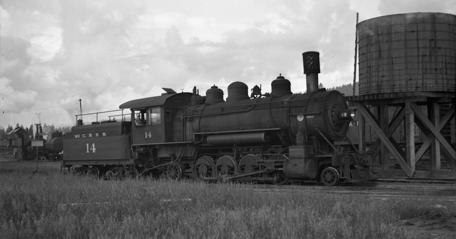 | Another shot of the #14 in Pondosa, this one shot by Max Miller on 3 Setpember 1948. The Ben Cheney lumber mill sawdust burner is visible in the background. |