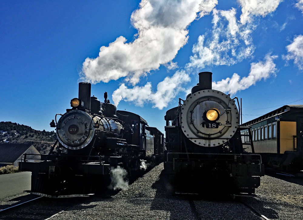 The #18, seen here on 12 February 2020 in Virginia City with the Virginia & Truckee's 2-8-0 #29, is back in steam for the first time in four years. Matt Simons photo.