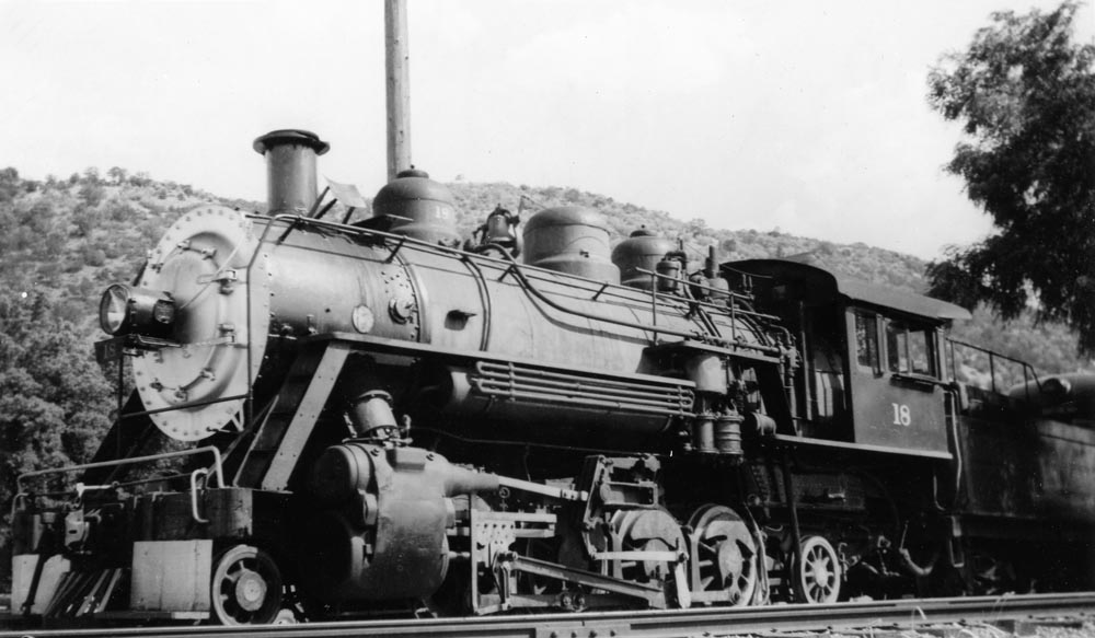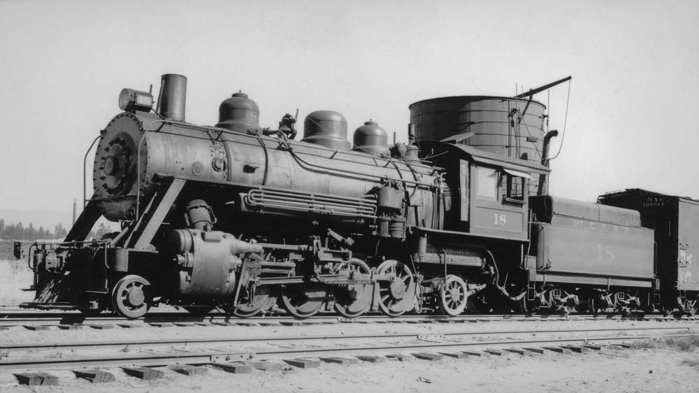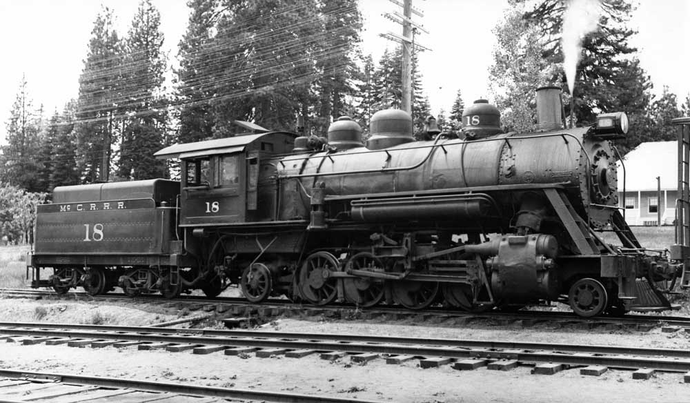 Locomotive #18 near the McCloud depot after losing the original stack cap. Photo from the George Landrock collection.