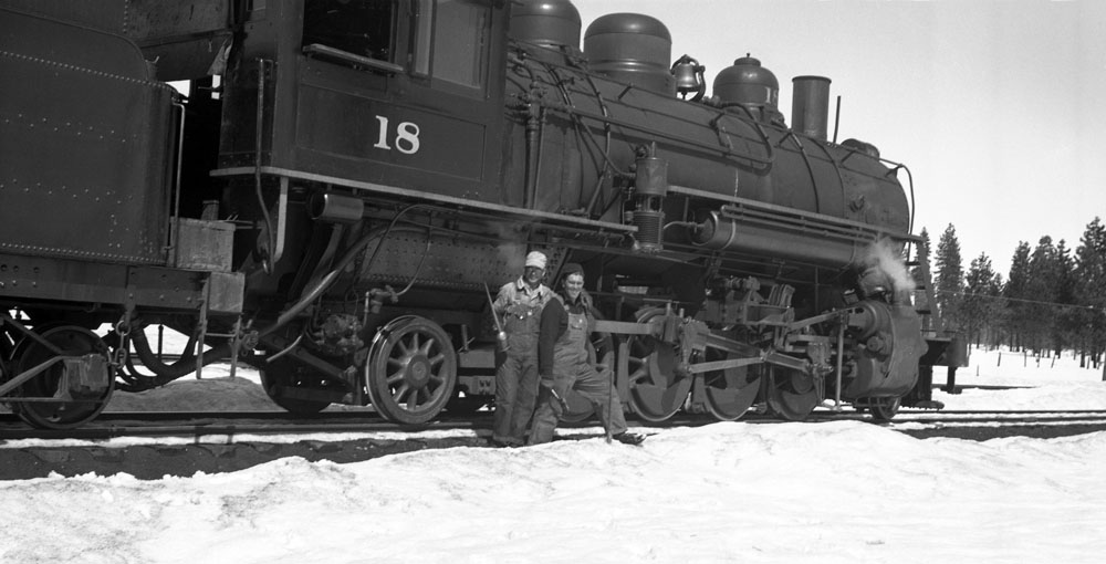 The #18's crew posing for the camera somewhere on the line prior to the 1939 installation of the spark arrestor. As with several of the other locomotives, the single phase air pump on the engineer's side would later be replaced with a powered reverser. T.E. Glover collection.