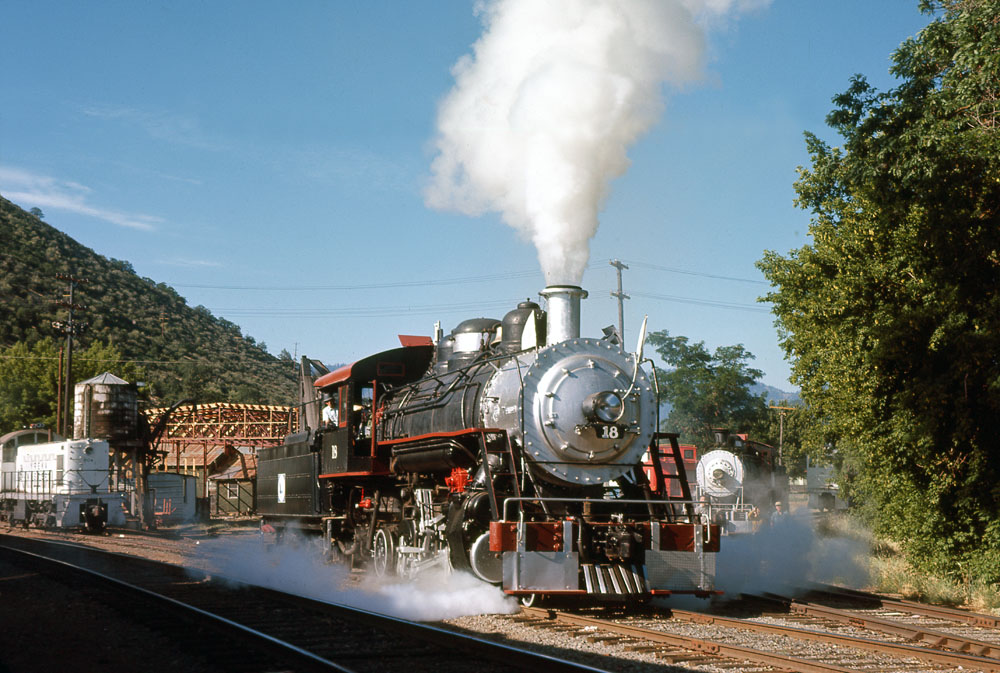 A color view of the #18 steaming in Yreka for a group of railfans around 1964. C.G. Heimerdinger, Jr. photo.