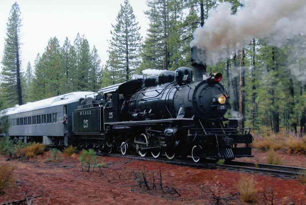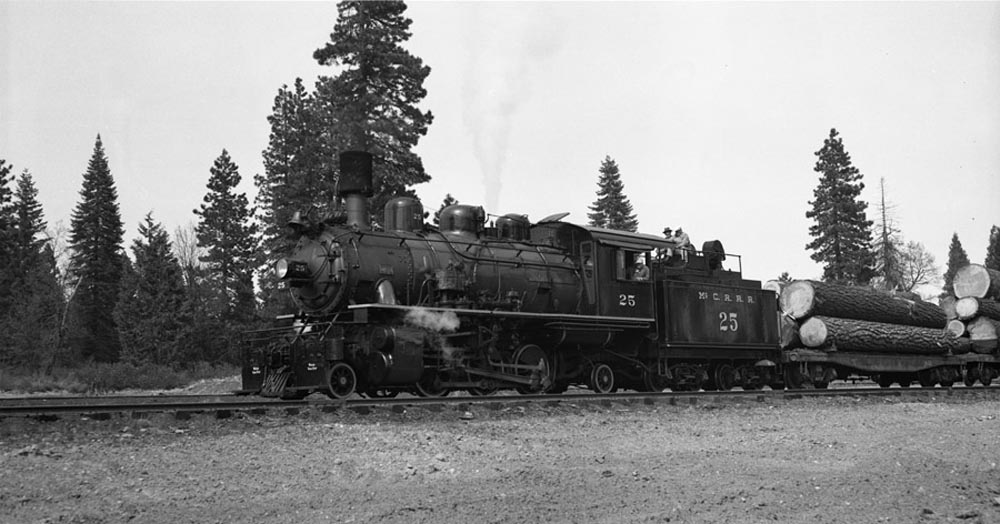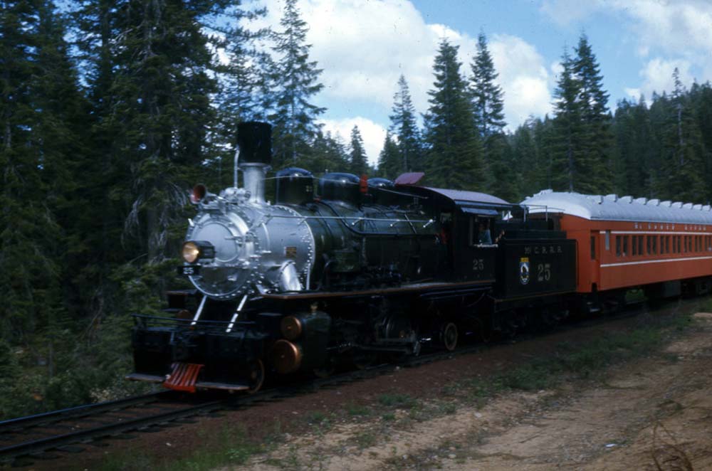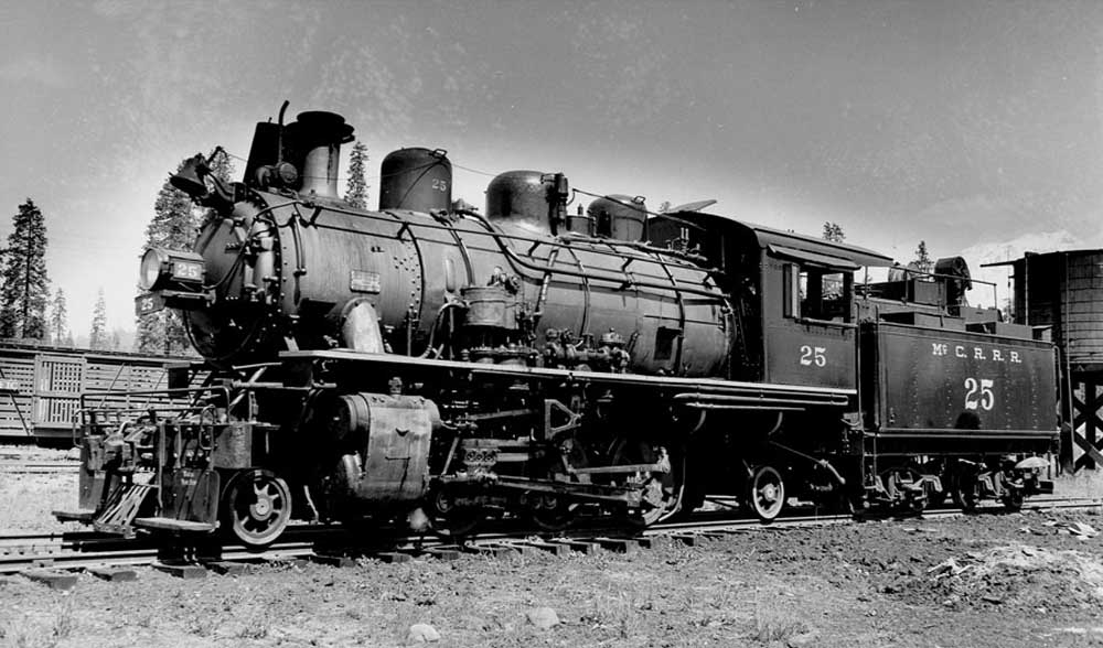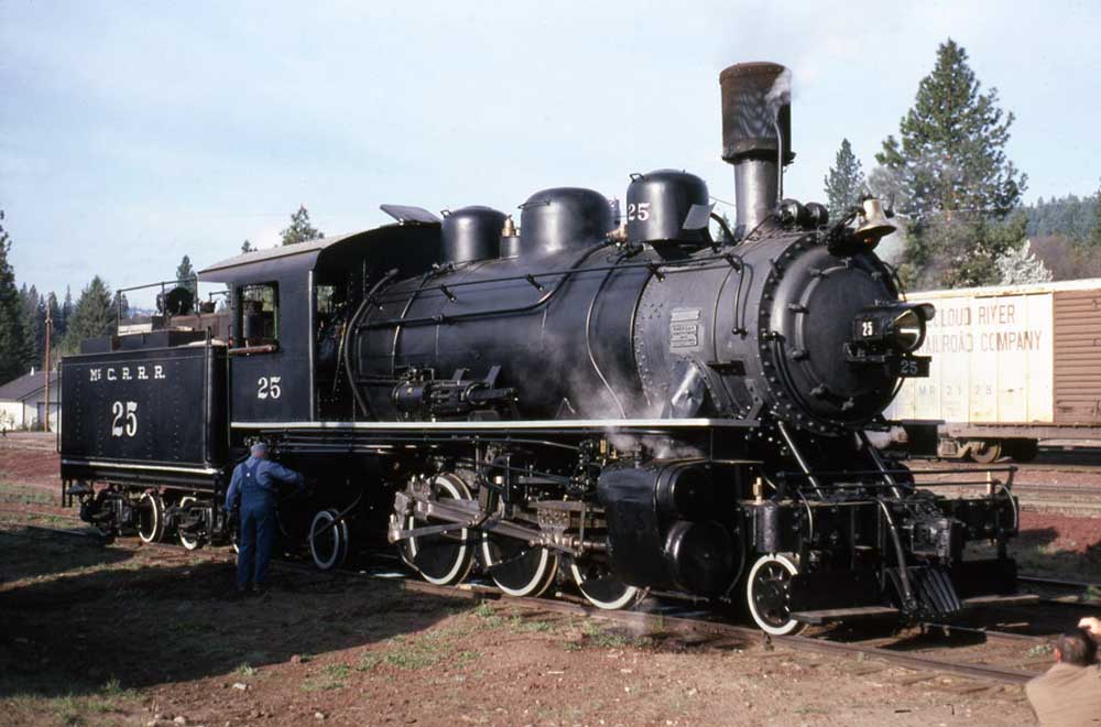 The #25 is by far the most well known and heavily photographed locomotive McCloud ever owned. The large Prairie put thirty years of service mostly on the logging end of the operations before the railroad placed it on the point of the 1955 Gold Spike Excursion marking completing the Burney extension. The #25 became especially well known in the railfan community in a sporadic career hauling passenger excursions that lasted from 1962-1975, 1982-1986, 1997-2001, and then a few trips in 2008. This popular locomotive lives on today, hauling tourists on the Oregon Coast Scenic Railroad out of Garibaldi, Oregon.