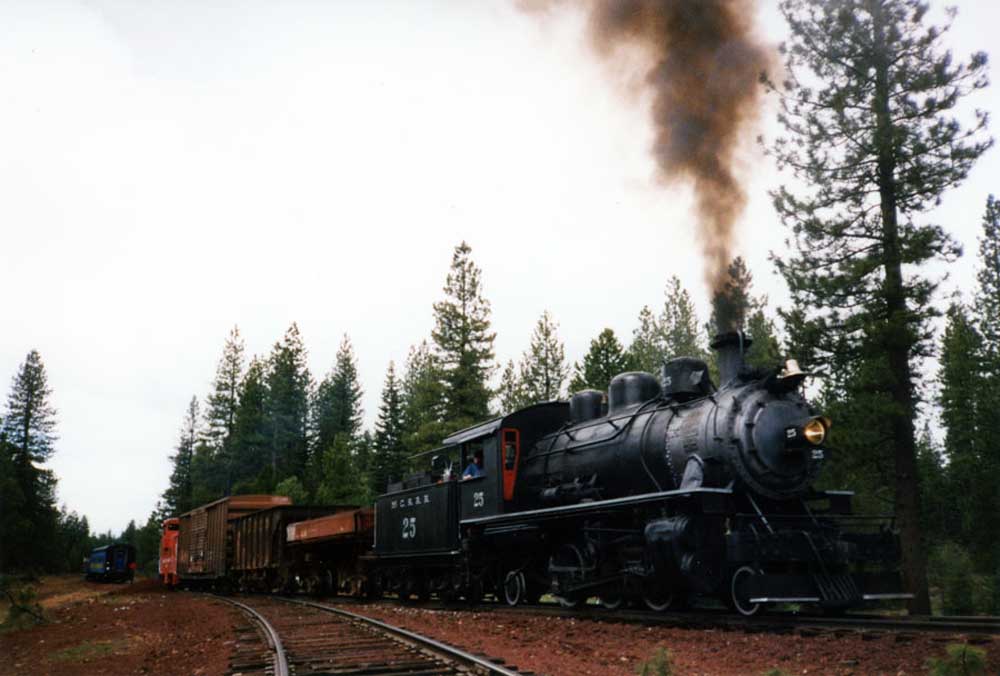 The McCloud Railway Company ended another long drought of no steam on the road when it brought the #25 back again in 1997. It's seen here with a chartered photo freight at the Bartle Wye around 1998. Alicia Moore photo.