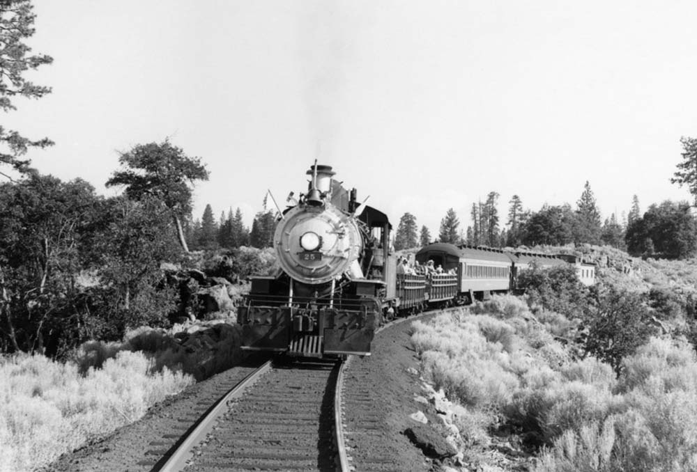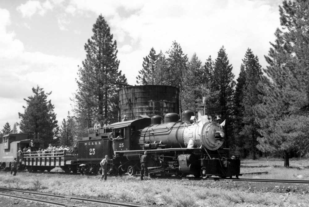 The #25 handled its first railfan excursion in 1953, a "Pondosa Logger" that hauled three cabooses full of riders from McCloud to Pondosa and back. The train took several empty boxcars for the Cheney mill out and brought a half dozen log loads back. This first excursion is seen here at Bartle in an image credited to Givens.