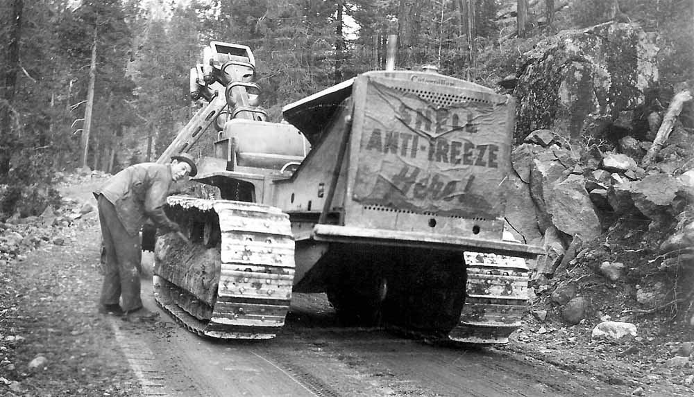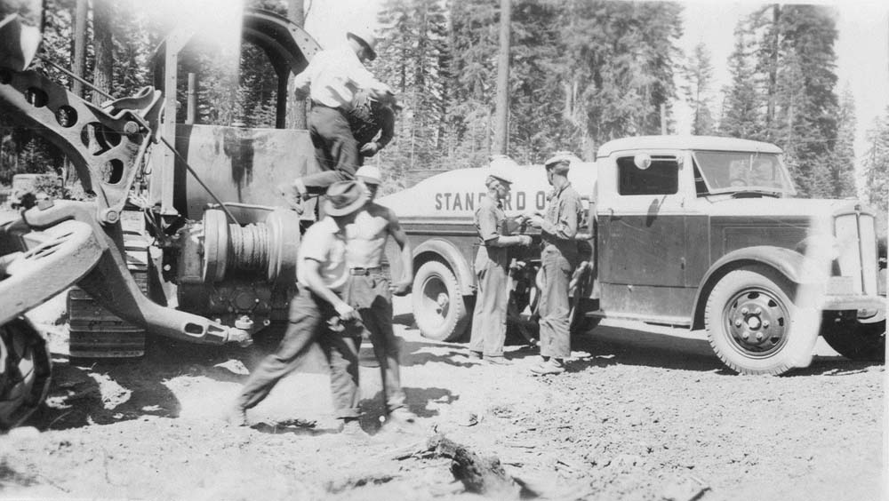 A diesel cat parked next to a fuel truck somewhere in the McCloud woods. Heritage Junction Museum.