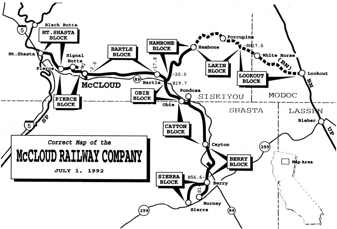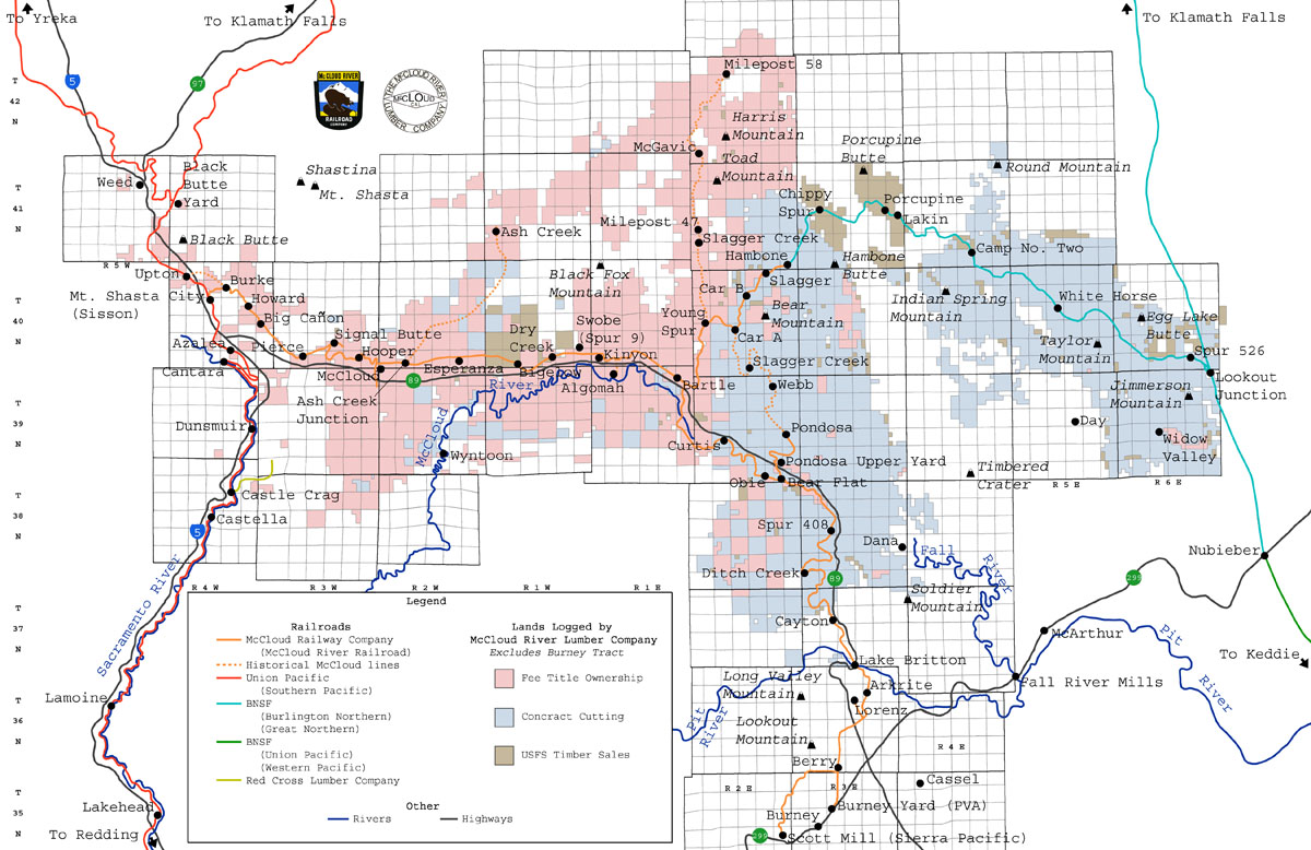 McCloud River Railroad map showing all station names, plus the lands the McCloud River Lumber Company either owned or logged under contract. Not shown is any logging railroad trackage.
