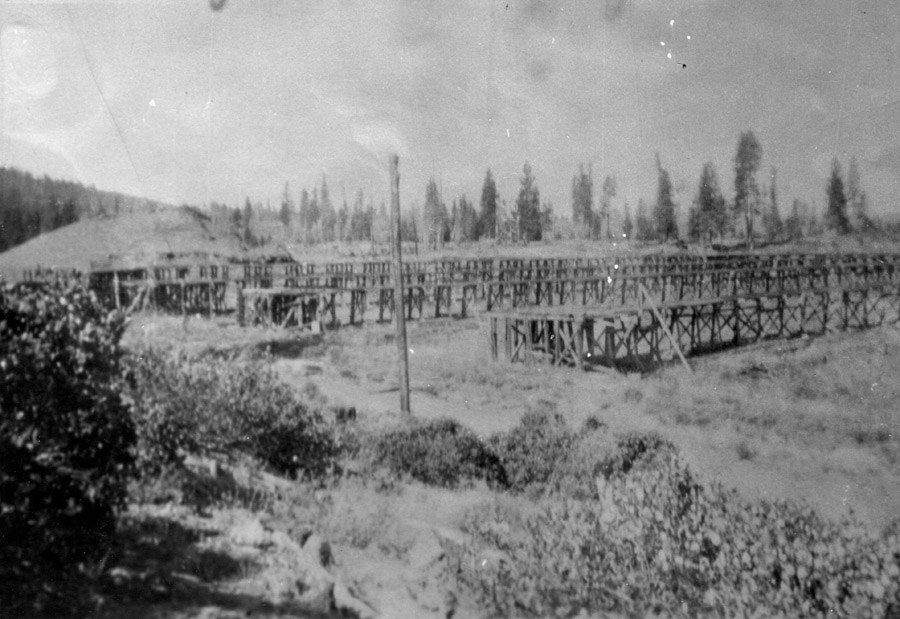 The sawdust piles and lumber drying racks in Hambone. Before it burned, the mill once stood to the right of the sawdust pile. |