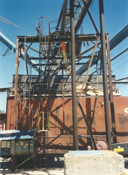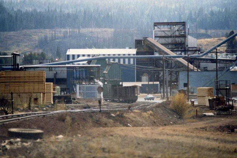 The woodchip loader the mill built in 1993 is on the left, with the lumber loading track on the right and the mainline running in between. |