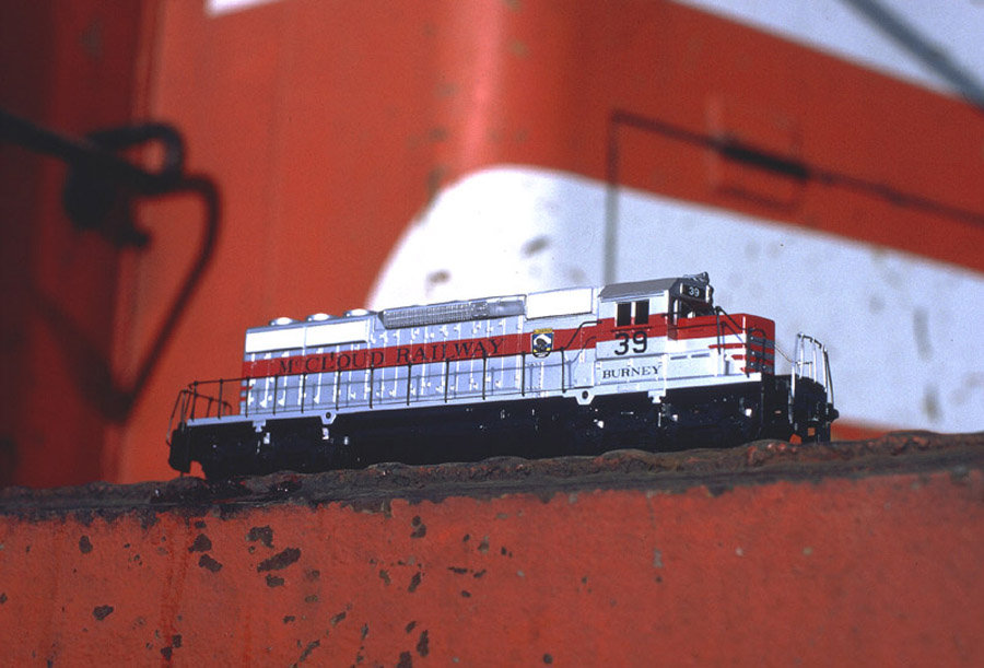 A model of McCloud Railway #39 siting on the real #39. This is a photo of "what might have been", as the real #39 did not last long enough on the McCloud Railway to get the new silver and red paint job introduced in 1996. Keith Ardinger photo.