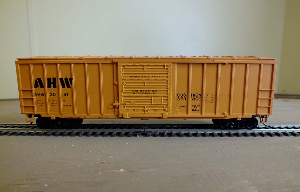 Incentive Per Diem Boxcars Until recently the only other commercially available car painted for the Ahnapee & Western beyond the refrigerator car was a run of HO scale Athearn single door boxcars the Bev-Bel Corporation had done probably sometime in the 1980s. Bev-Bel had been in business since 1956 and specialized in producing models of rare or obscure cars, plus some other thematic cars. The Bev-Bel cars are basically correct for the 100 cars in AHW's 2000-2099 series. In recent years Fox Valley Models has released a N scale 50-foot, double door boxcar lettered for the AHW and in at least two road numbers that are correct for the road's 4000-4099 series. Athearn in one of their recent runs of HO scale 50-foot double door boxcars included several lettered for the Hartford & Slocomb, which would be relatively easy to convert to AHW cars. ![]() Bev-Bel's model of an AHW incentive per diem boxcar. |