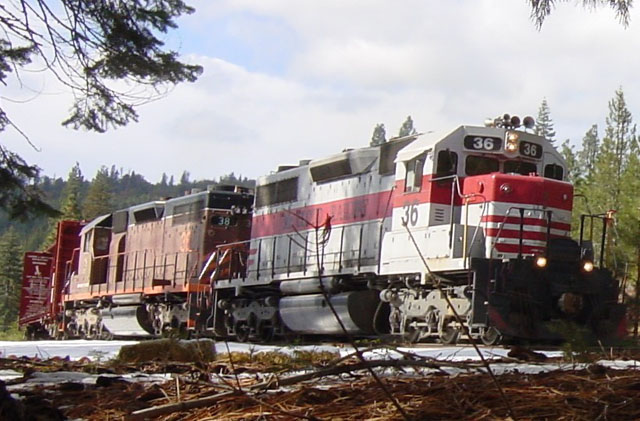 Yes...this is a models page...but McCloud Rails staff could not resist adding this fine shot captured by James' wife Janice of the #36 and #38 on the tail track of the Signal Butte switchback in October 2004. |