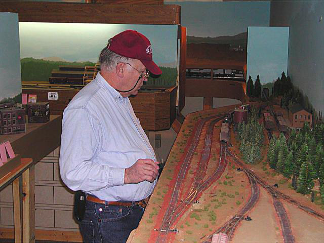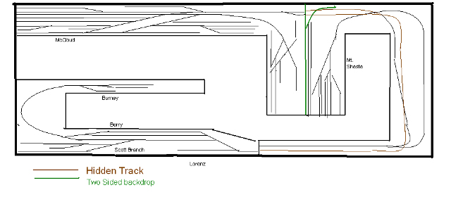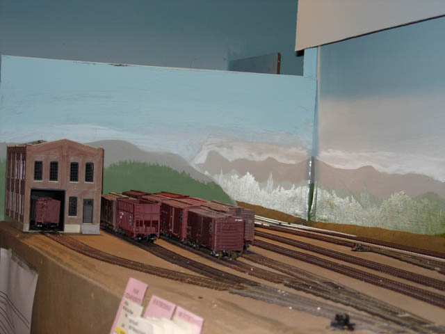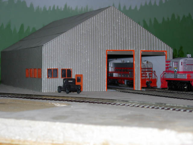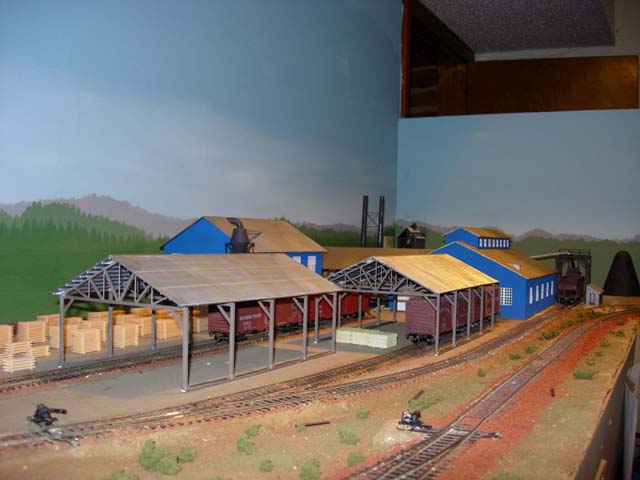 This part of the layout represents Mt. Shasta City and the interchange with the Southern Pacific. The building to the left represents the P&M Cedar Products sawmill. |