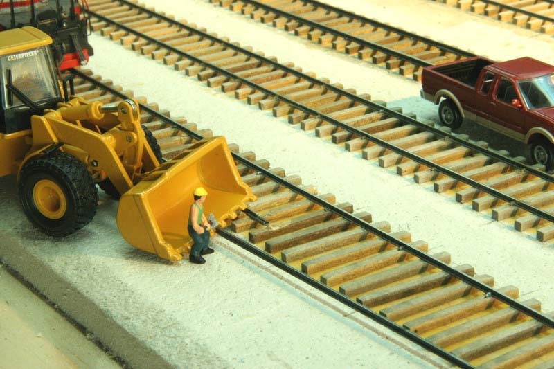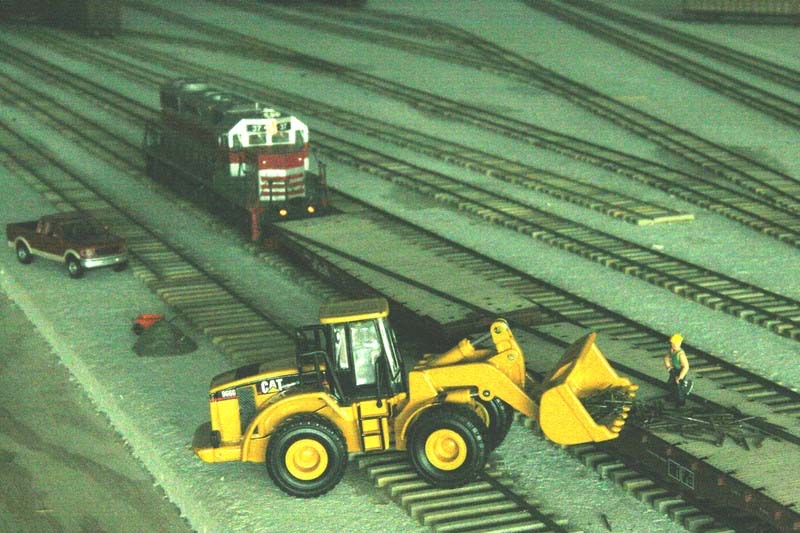 The 966 loader is on hand to unload the track materials from the flatcars. |