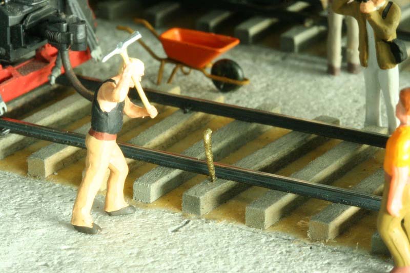 The final rail is in place and the spiking has begain. |