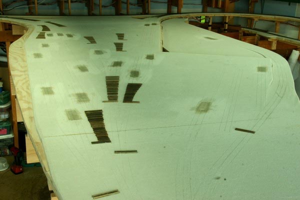Fast forwarding again in time, we find that Lee has finished the base for the McCloud part of the layout. The yard track locations have been sketched onto the base, and Lee has started laying the ties underneath the future switch locations. |