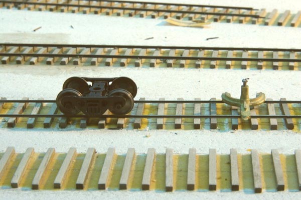 One last photo of the tracks under construction. Lee is laying most of the yard tracks with Code 40 and Code 55 rail, which scales out to approximately 40 and 75 lbs./yard rail respectively in HO scale. The small rail size of the Code 40 rail is readily apparent once a standard freight car truck is thrown in for scale. We hope you have enjoyed this tour of the layout under construction. Additional photos will be posted in the future as Lee completes the portions of the layout. |