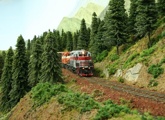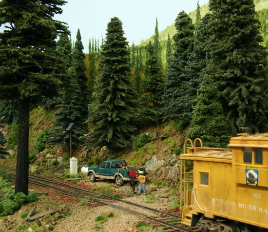 Some deer grazing near the tracks as a train rolls through the trees. Lee has done a good job replicating the many fills found on this railroad. |