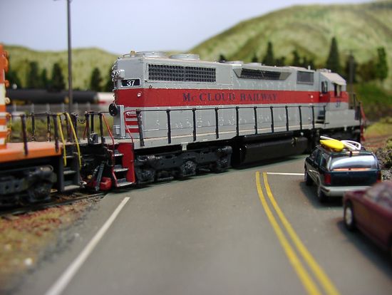 SD38 #37 and SD38-2 #39 are seen here crossing Mount Shasta Blvd. during switching operations in Mount Shasta City. The #37 started out as an Overland brass import that Lee painted and detailed to match the prototype. |