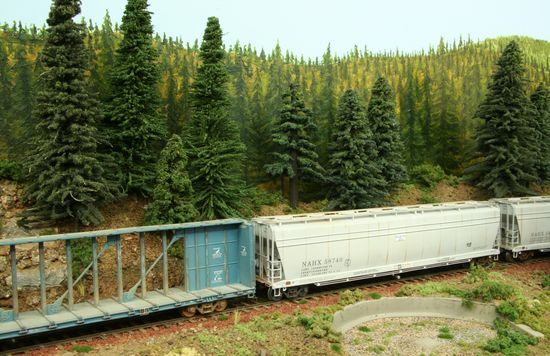 We'll start our tour of Lee's layout in Mount Shasta City, where a string of empties are seen waiting for the McCloud Railway on the interchange track. |