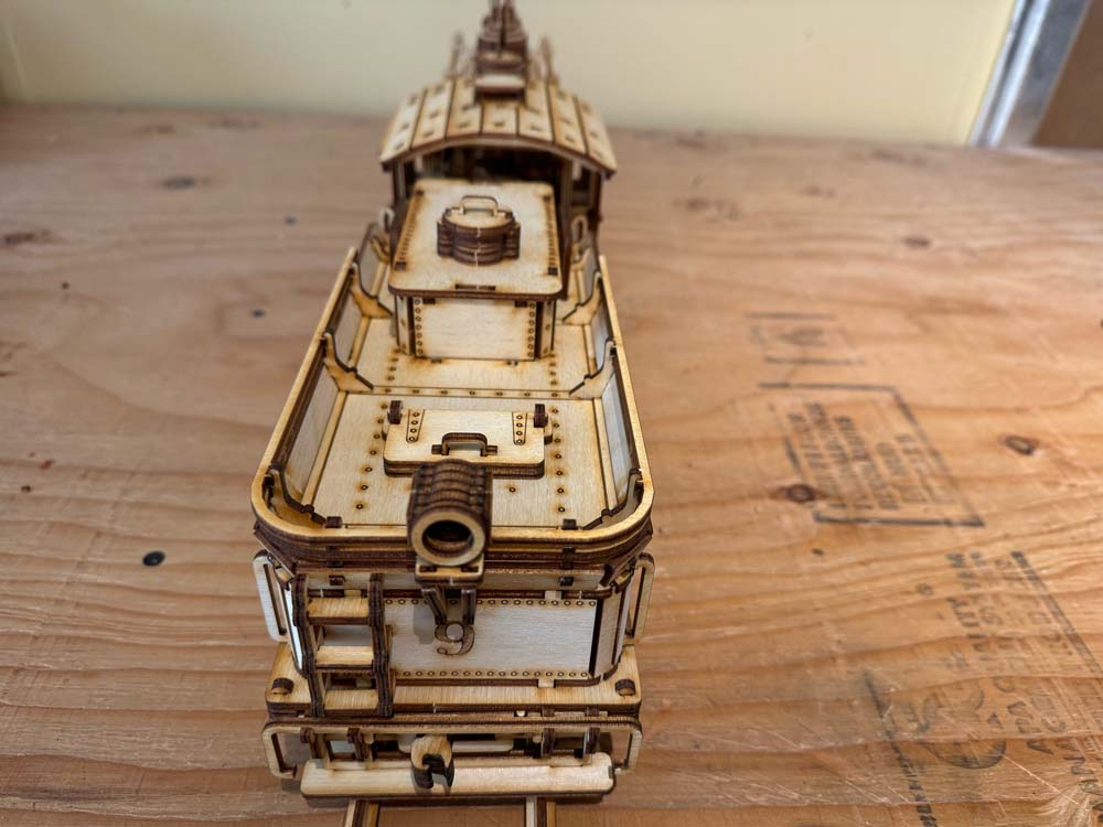 Work shifted to the back end of the locomotive once the front end had been completed. This view shows some of the extra details burned into the wood. |