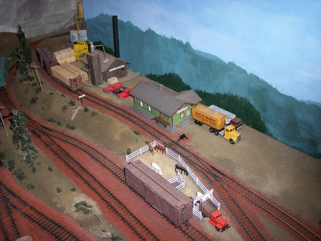 An overview of the McCloud yard and sawmill. Hooper tank is just visible in the lower left corner, with a fire car on the track next to it. The ballast train is spotted on one of the yard tracks. |